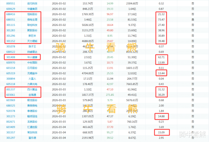 3月2日(周一)恒烁股份解禁比例达到21.32%;微电生理解禁比例达到73.47%;联检科技解禁比例达到27.4%;聚胶股份解禁比例达到38.96%;新巨丰解禁比例达到30.89%;天力锂能解禁比例达到39.48%;华人健康解禁比例达到62.71%。