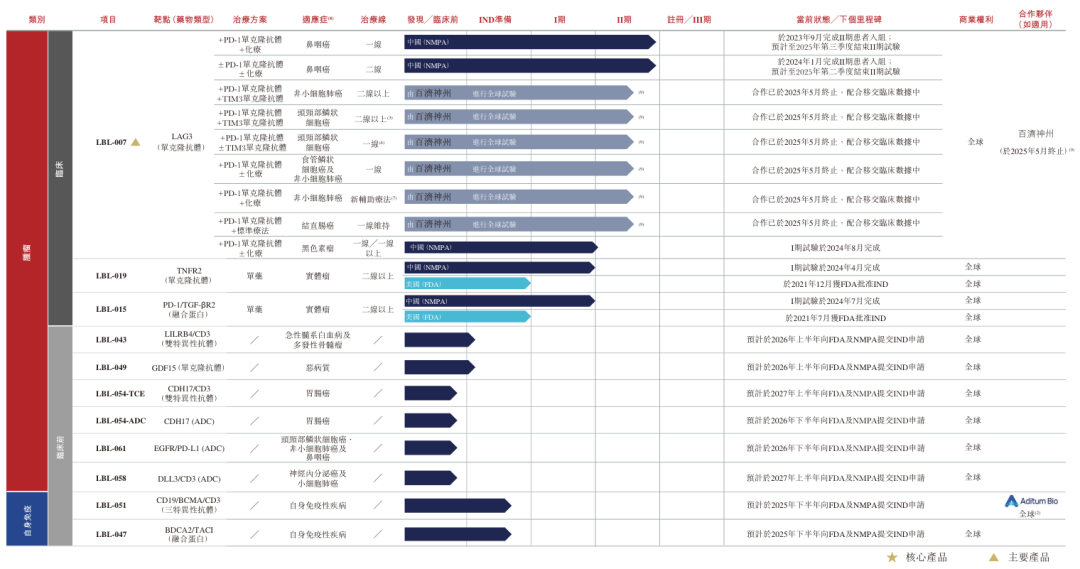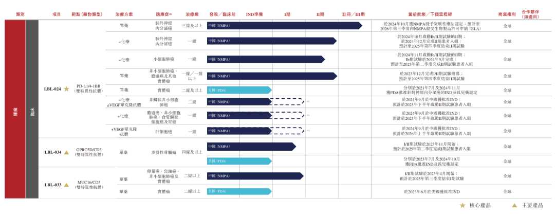 LBL-024(PD-L1/4-1BB双抗):全球首个进入注册临床阶段的靶向4-1BB疗法,用于肺外神经内分泌癌等多种适应症,获中国NMPA与FDA突破性疗法认定,预计2029年提交BLA。
