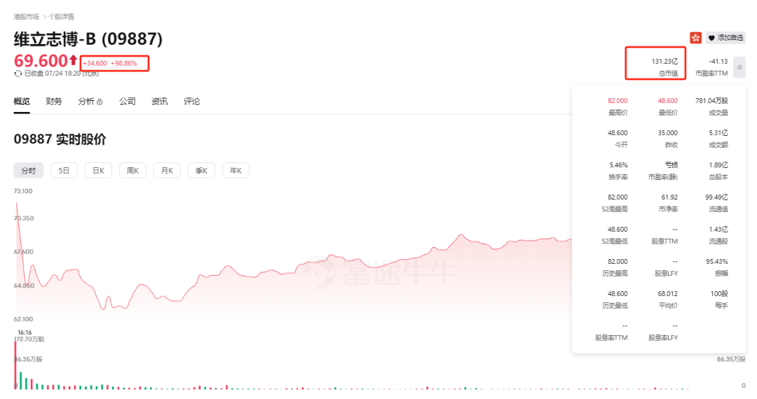 作为又一家18A生物科技公司,其港股暗盘交易表现火热。截至发稿,富途牛牛数据显示,其暗盘交易报价69.55港元,较招股价35港元上涨98.86%!总市值超130亿港元!