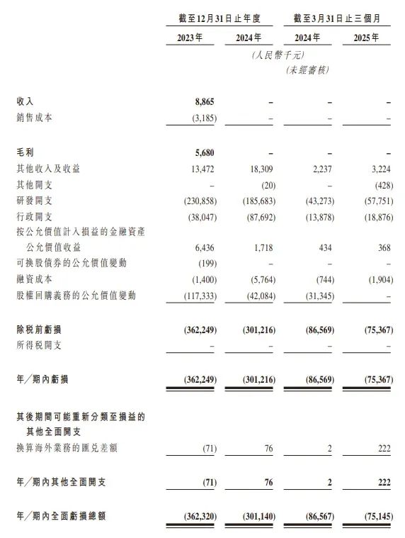 维立志博作为尚未商业化的临床阶段生物科技企业,近年来持续投入于研发。财务方面,2023年及2024年,公司分别录得人民币3.62亿元及3.01亿元的全面亏损。截至2024年及2025年3月31日止的前三个月,亏损分别为8656.7万元及7514.5万元。亏损主要来源于高强度的研发支出、行政开支以及股权回购义务的公允价值变动。